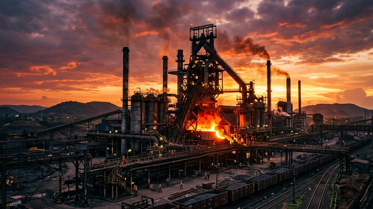 Image brief: Aerial or interior view of a blast furnace steel facility in India. Text overlay: "CBAM India: 24.4% Export Drop in 2025". Commission as branded illustration with cbamguide.com logo.